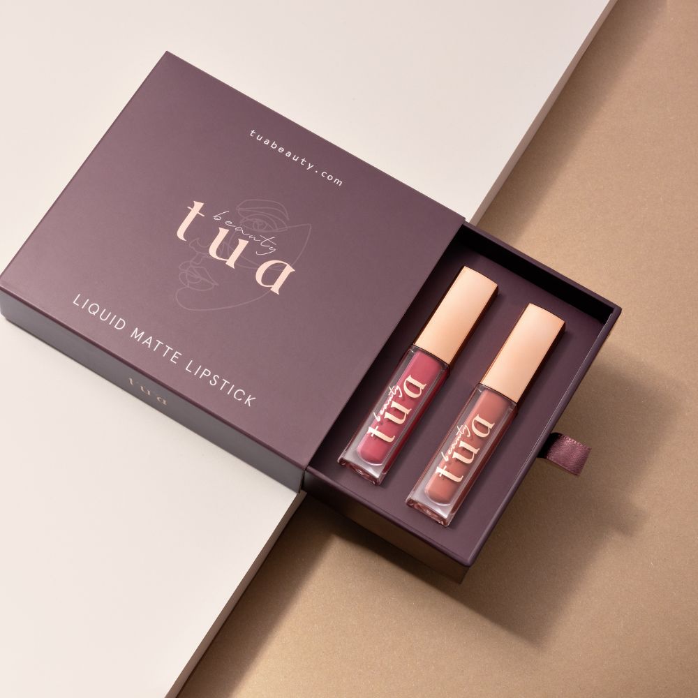 Mais moderna e luxuosa do que nunca, a nova TUA Beauty coloca os lábios em tons ousados com um efeito aveludado mate. Os conjuntos de batons oferecem um poder de permanência médio que proporciona aos lábios uma hidratação intensa, ajudando a prevenir a secura dos lábios.
